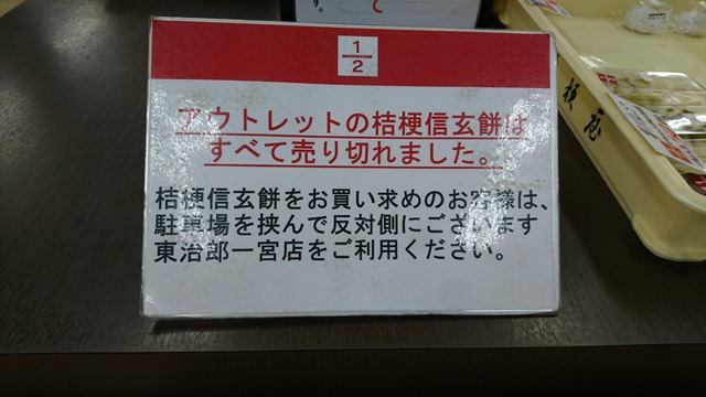 桔梗屋の工場では、賞味期限があと2日となっている信玄餅を通常価格の半額で買うことができます。そして、これも大人気です。お昼過ぎに工場に行くと、下の写真のように売り切れてしまいます。